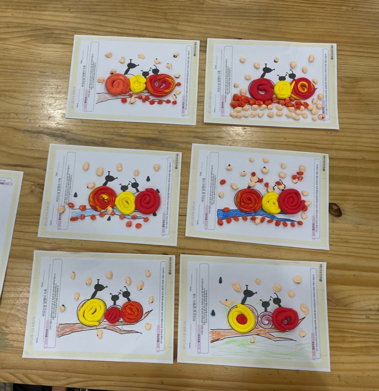 길쭉하게 만든 클레이를 달팽이 가족의 집 모양으로 돌돌 말아 붙여 완성합니다. 이 활동은 어르신들의 상상력과 창의성을 자극하며, 하나의 작품을 만들어가는 성취감을 느끼게 합니다.